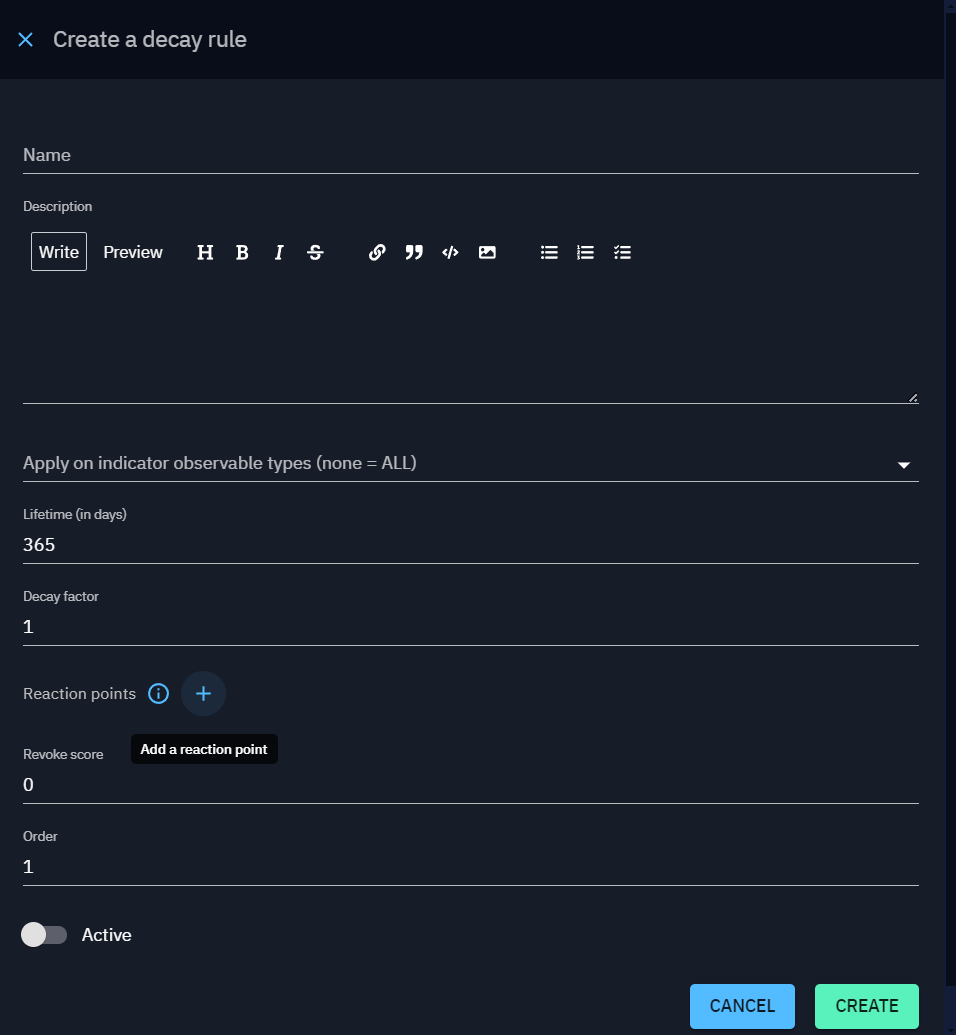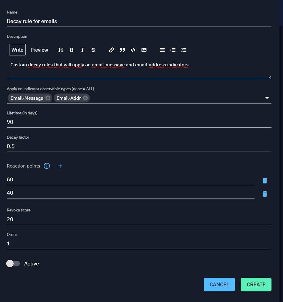 There are built-in decay rules that can't be modified and are applied by default to indicators depending on their main observable type. Decay rules are applied from highest to lowest order (the lowest being 0).