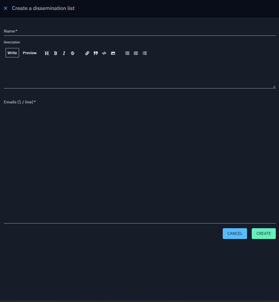 Click on create dissemination list: simply add a name & copy/paste or write all the emails you want emails to be sent to. You need to have one email per line.