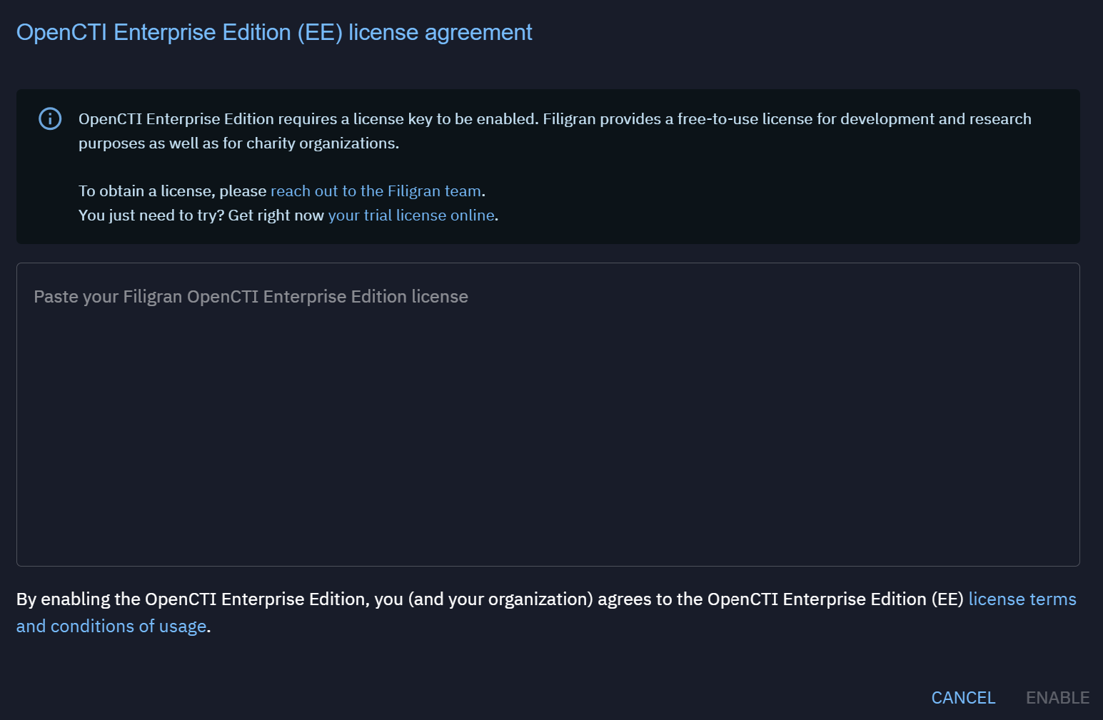 - For all other usages including On-Premise deployments, OpenCTI Enterprise Edition is reserved to organizations that have signed a Filigran Enterprise agreement.