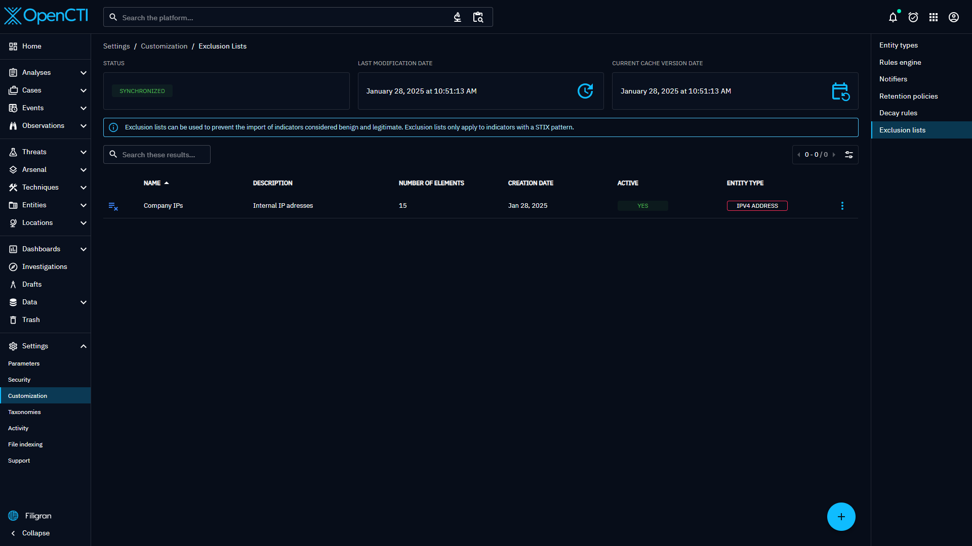 Once the last modification date and the Current cache version date are up to date, the status is Synchronized again. Your new exclusion list is ready to be applied!