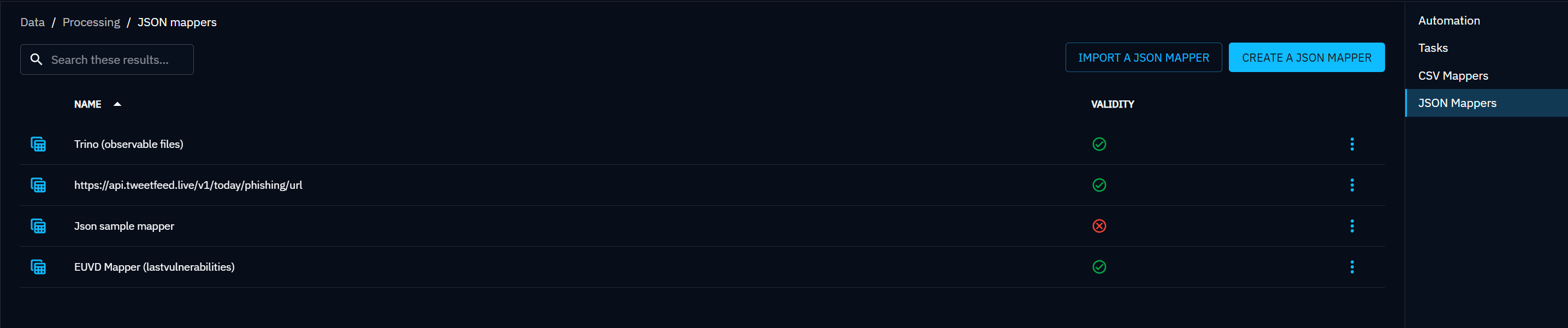 In menu Data, select the submenu Processing, and on the right menu select JSON Mappers. You are presented with a list of all the mappers set in the platform. Note that you can delete or update any mapper from the context menu via the burger button beside each mapper.