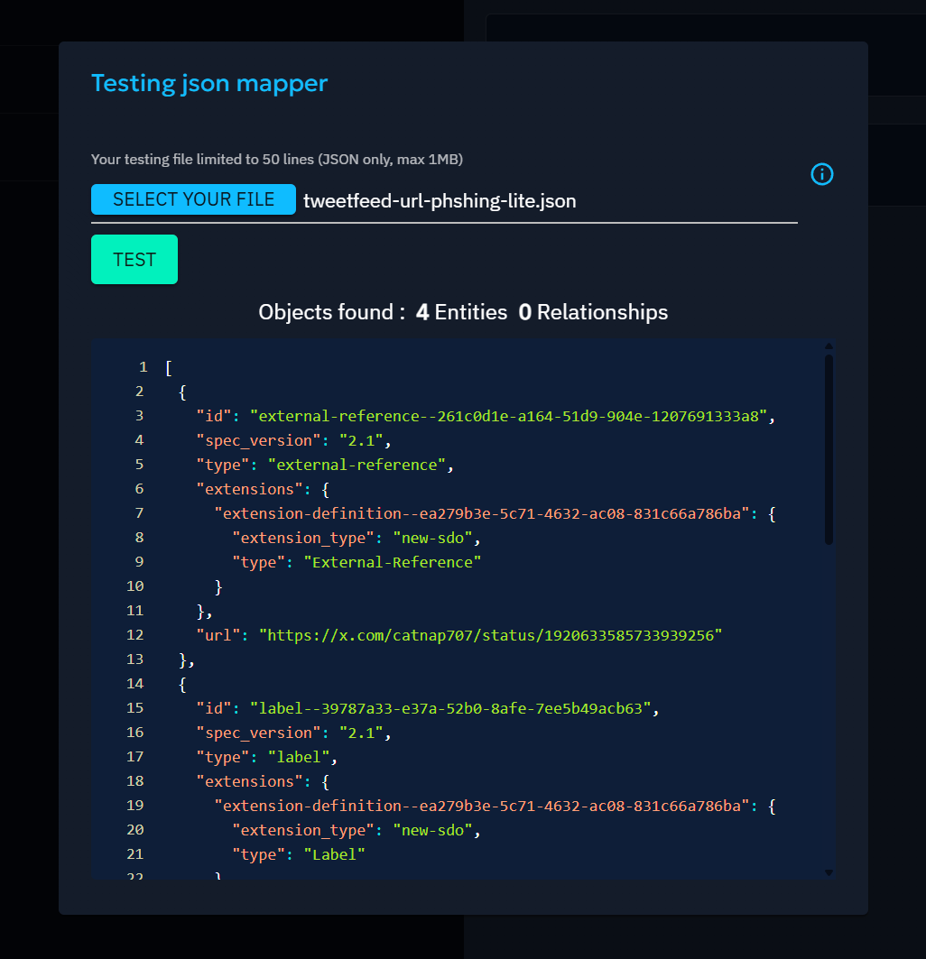 The test conducted in this window relies only on the translation of JSON data according to the chosen representation in the mapper. It does not take into account checks for accurate entity formatting (e.g. IPv4) or specific entity configurations (e.g. mandatory "description" field on reports). Consequently, the entities visible in the test window may not be created during the actual import process.
