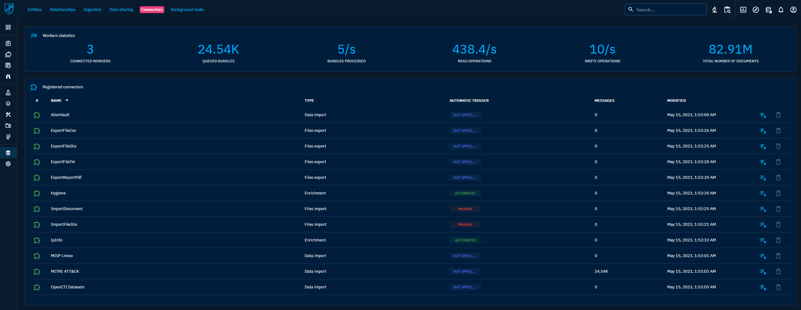 These connectors automatically retrieve information from an external organization, application, or service, and convert it to STIX 2.1 bundles. Then, they import it into OpenCTI using the workers.