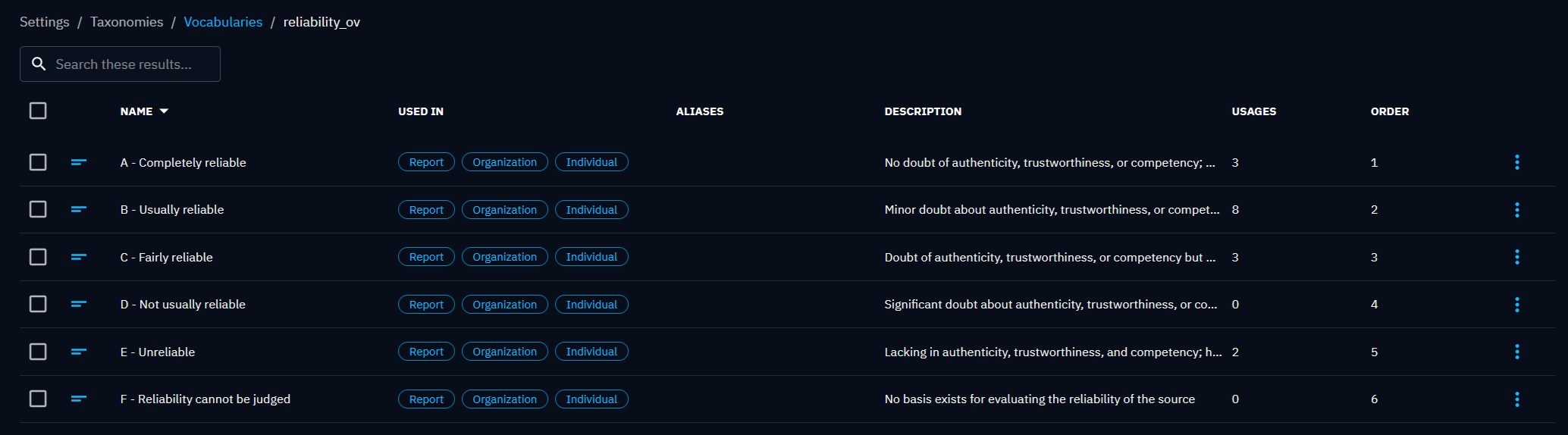 | Reliability vocabulary (reliability_ov) | Report, Organization | A - Completely reliable, B - Usually reliable, C - Fairly reliable, D - Not usually reliable, E - Unreliable, F - Reliability cannot be judged |