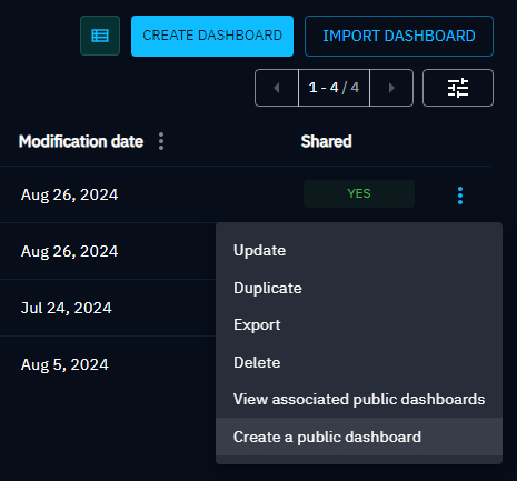 - In your list of custom dashboard page, you'll find a button that opens a panel to create the public dashboard associated with this custom dashboard.
