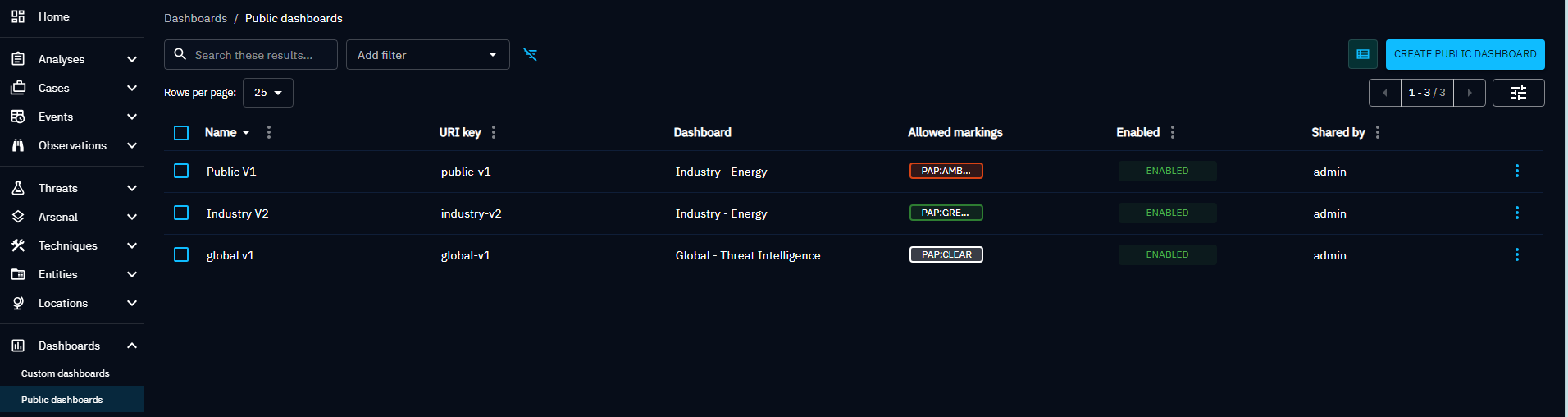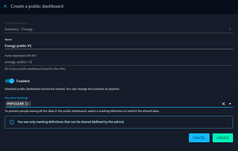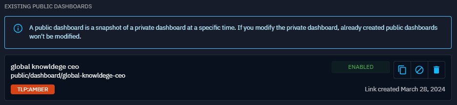 In this list each item represents a public dashboard you have created. For each you can see its name, path of the URL, max marking definitions, the date of creation, the status to know if the dashboard is enabled or not and some actions.
