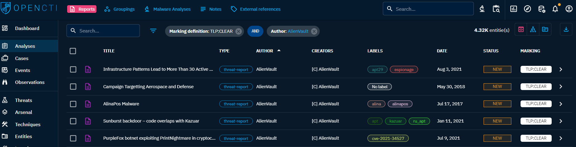 Reports: See Reports as a sort of containers to detail and structure what is contained on a specific report, either from a source or write by yourself. Think of it as an Intelligence Production in OpenCTI.Groupings: Groupings are containers, like Reports, but do not represent an Intelligence Production. They regroup Objects sharing an explicit context. For example, a Grouping might represent a set of data that, in time, given sufficient analysis, would mature to convey an incident or threat report as Report container.Malware Analyses: As define by STIX 2.1 standard, Malware Analyses captures the metadata and results of a particular static or dynamic analysis performed on a malware instance or family.Notes: Through this tab, you can find all the Notes that have been written in the platform, for example to add some analyst's unstructured knowledge about an Object.External references: Intelligence is never created from nothing. External references give user a way to link sources or reference documents to any Object in the platform.