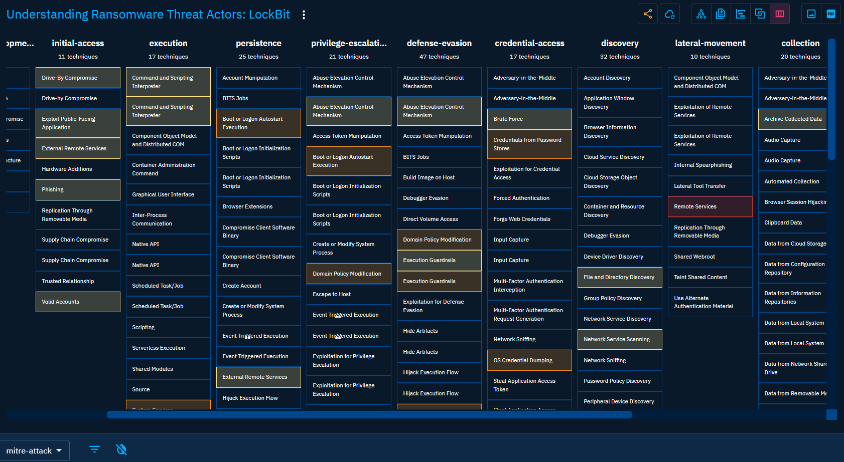 If your Report describes let's say an attack, a campaign, or an understanding of an Intrusion set, it should contains multiple attack patterns Objects to structure the Knowledge about the TTPs of the Threat Actor. Those attack patterns can be displayed as highlighted matrices, by default the MITRE ATT&CK Enterprise matrix. As some matrices can be huge, it can be also filtered to only display attack patterns describes in the Report.