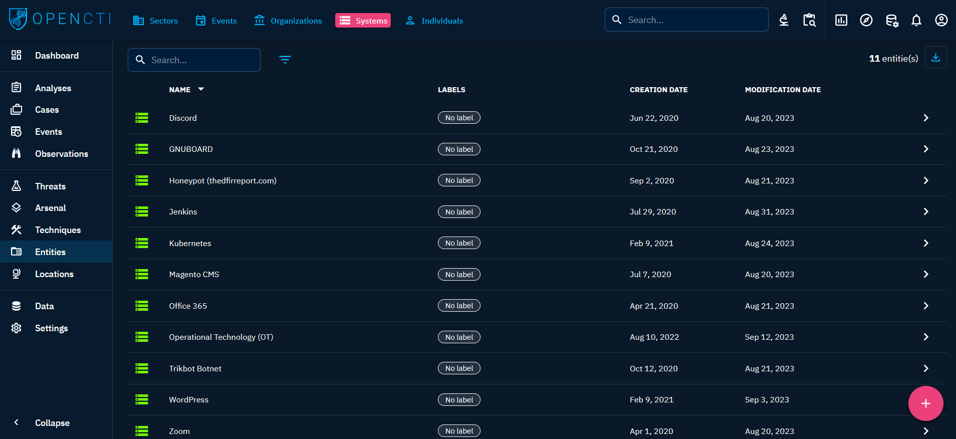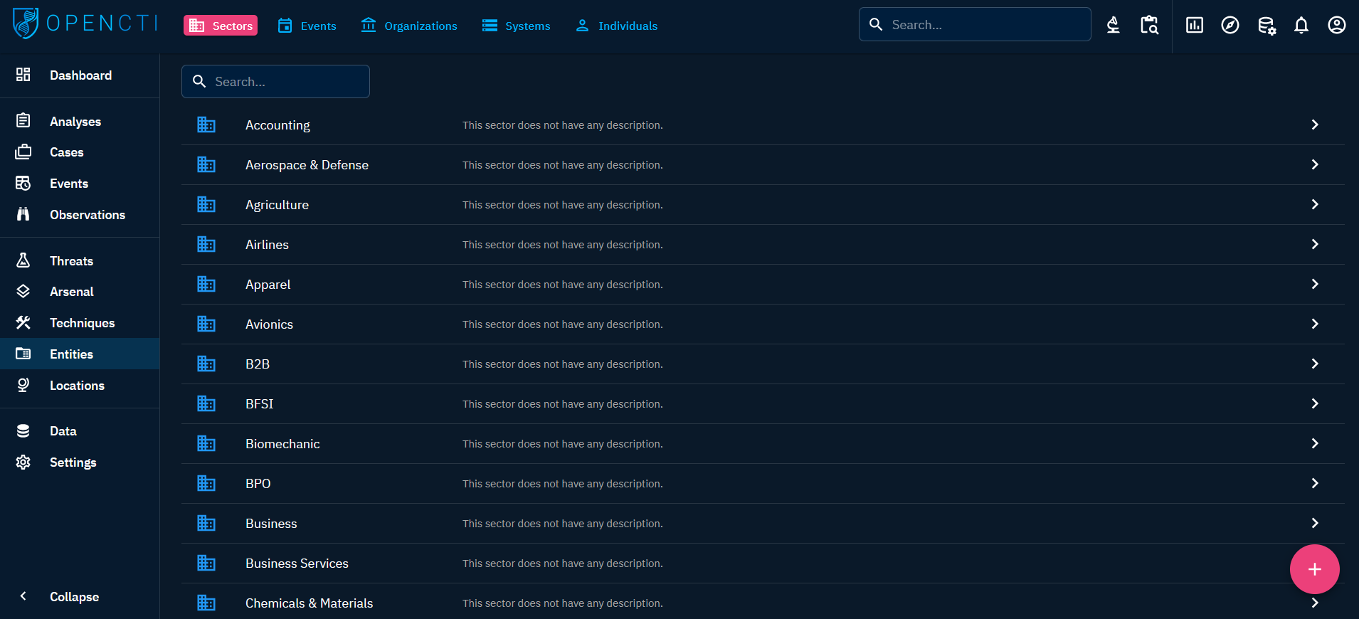 OpenCTI's Entities objects provides a comprehensive framework for modeling various targets and attack victims within your threat intelligence data. With five distinct Entity object types, you can represent sectors, events, organizations, systems, and individuals. This robust classification empowers you to contextualize threats effectively, enhancing the depth and precision of your analysis.