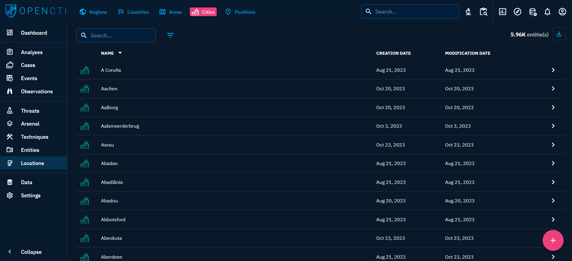 When clicking on the Cities tab at the top left, you see the list of all the Cities you have access to, in respect with your allowed marking definitions.