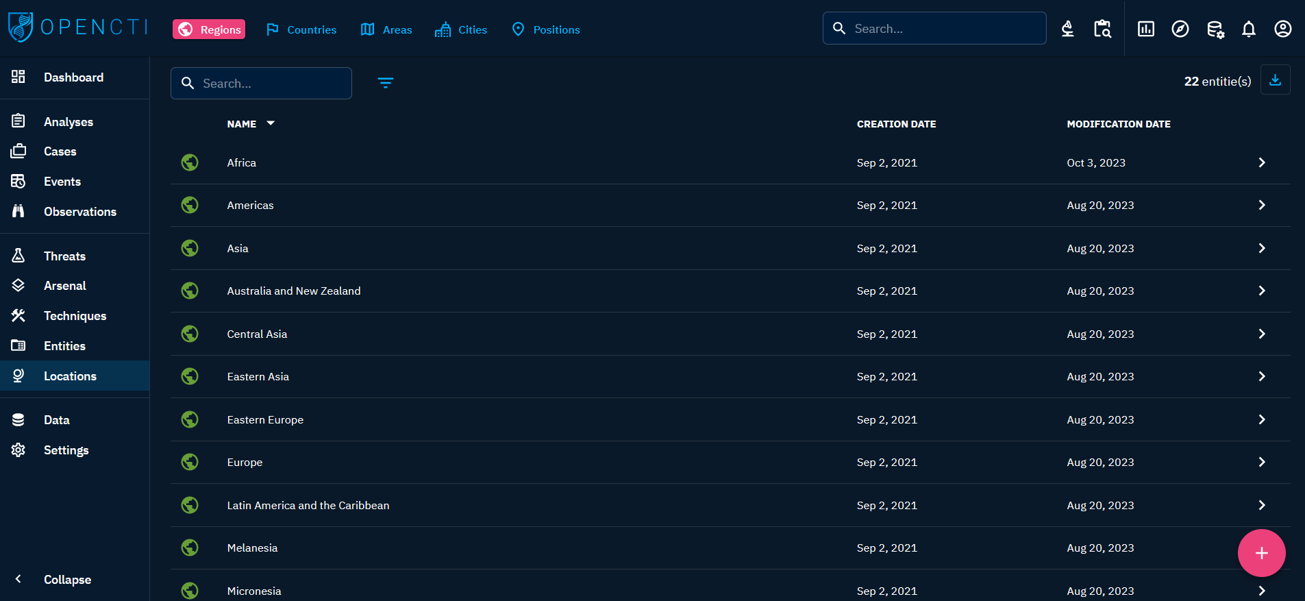 OpenCTI's Locations objects provides a comprehensive framework for representing various geographic entities within your threat intelligence data. With five distinct Location object types, you can precisely define regions, countries, areas, cities, and specific positions. This robust classification empowers you to contextualize threats geographically, enhancing the depth and accuracy of your analysis.