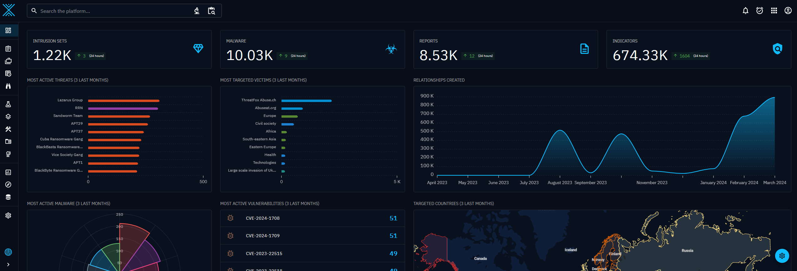 | Most active threats (3 last months) | Top active threats (threat actor, intrusion set and campaign) during the last 3 months. |