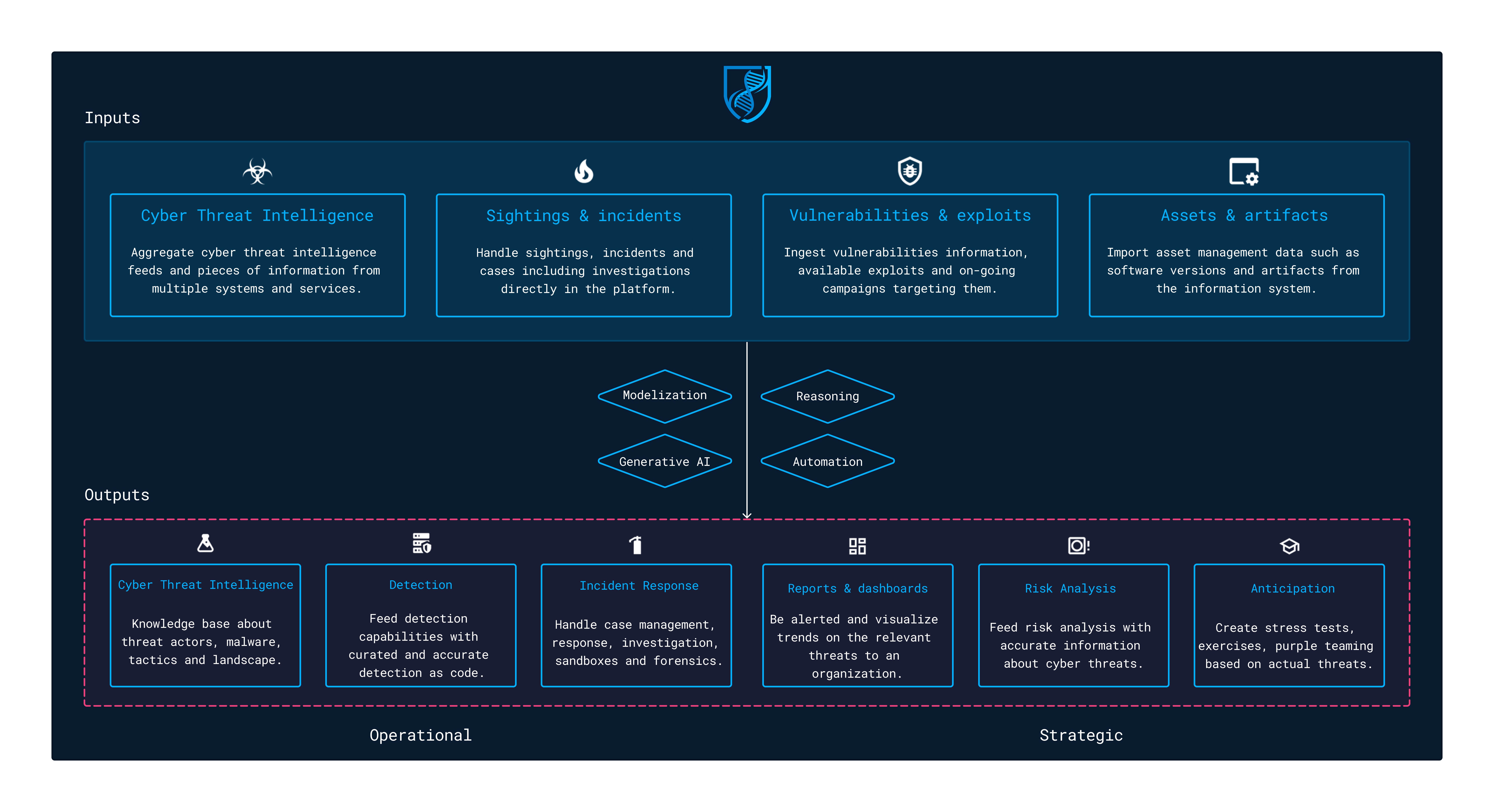 This guide aims to give you a full overview of the OpenCTI features and workflows. The platform can be used in various contexts to handle threats management use cases from a technical to a more strategic level. OpenCTI has been designed as a knowledge graph, taking inputs (threat intelligence feeds, sightings & alerts, vulnerabilities, assets, artifacts, etc.) and generating outputs based on built-in capabilities and / or connectors.