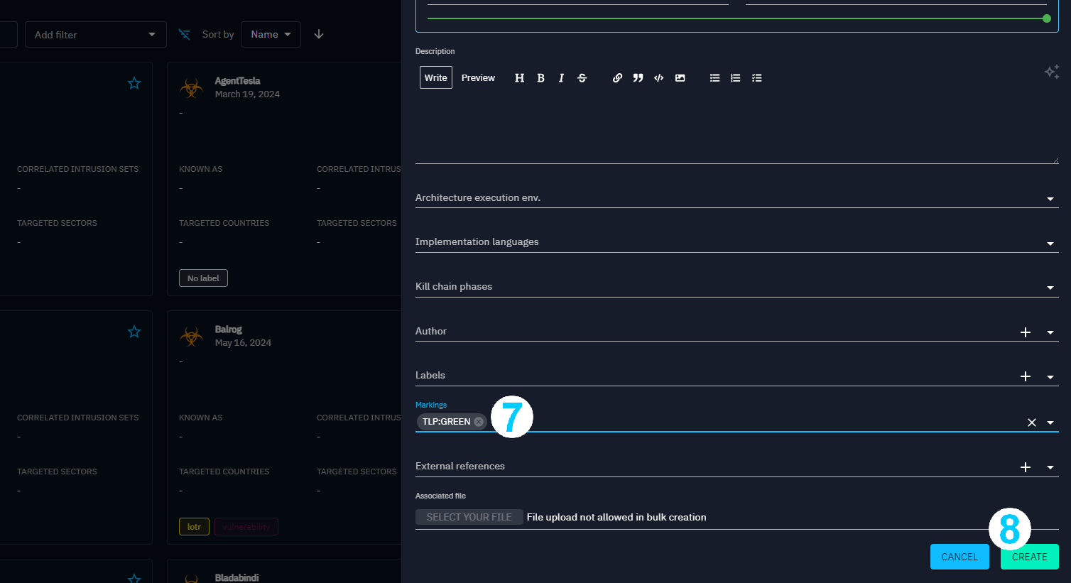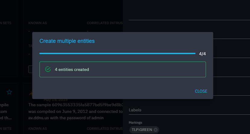 Fill other fields if necessary. Pay attention that for others fields than Name, all the created entities will have the same values. For example if I set a Marking to TLP:GREEN, all four malwares will have this marking.