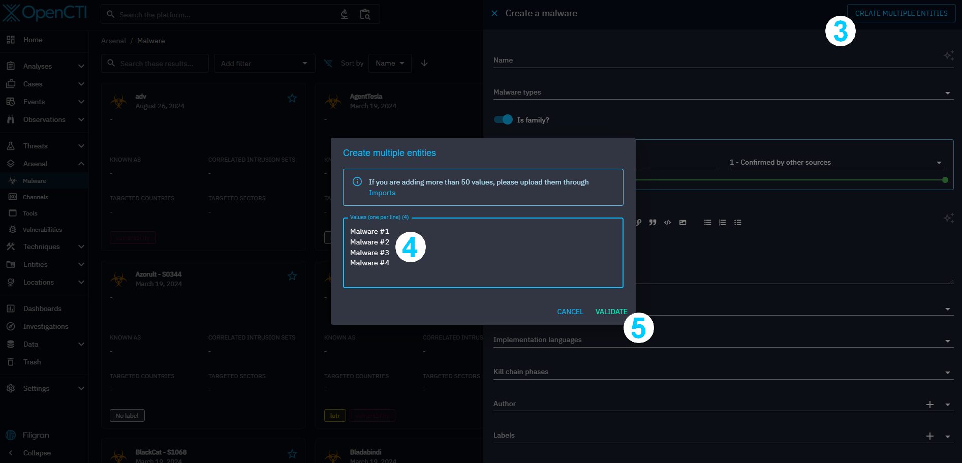 - A modal opens with a textarea input. You can fill multiple lines, each line will be an entity to create. In the example below, we will create four malwares with respectively names: Malware #1, Malware #2, Malware #3 and Malware #4.