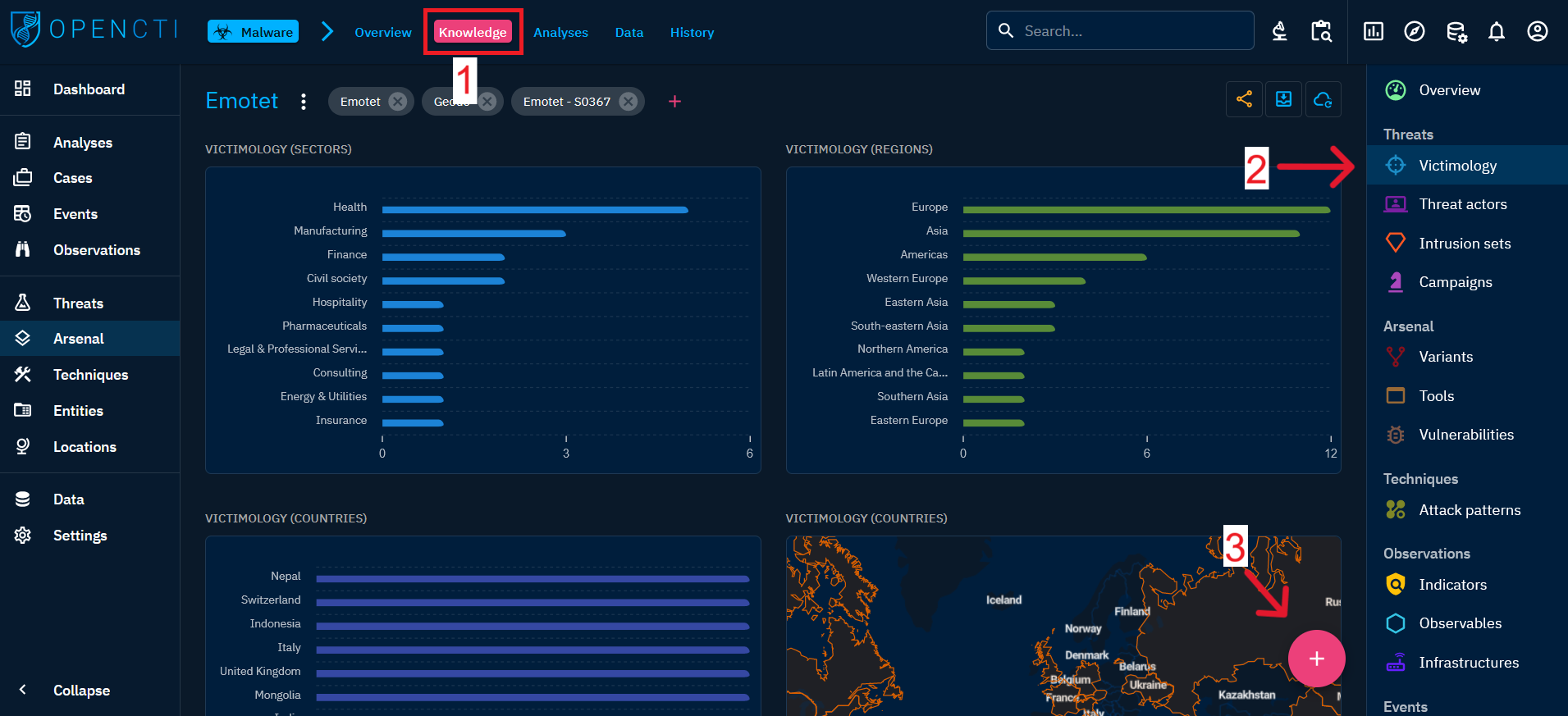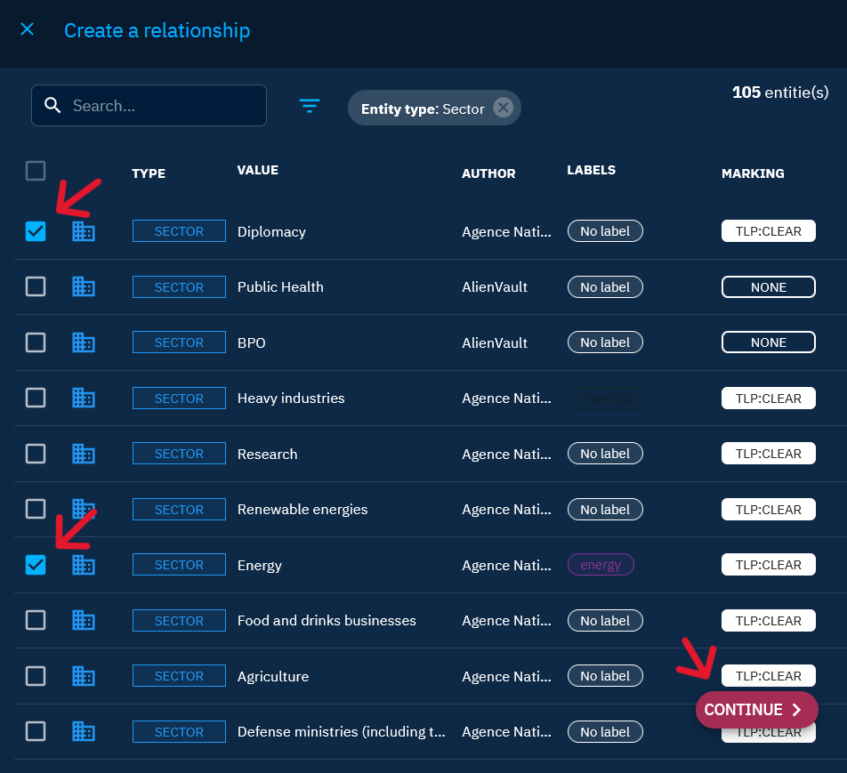 - Select the relevant categories: In the right banner, navigate to the categories that correspond to the object to be linked. The available categories depend on the type of entity you are currently on. For example, if you are on malware and want to link to a sector, choose "victimology."