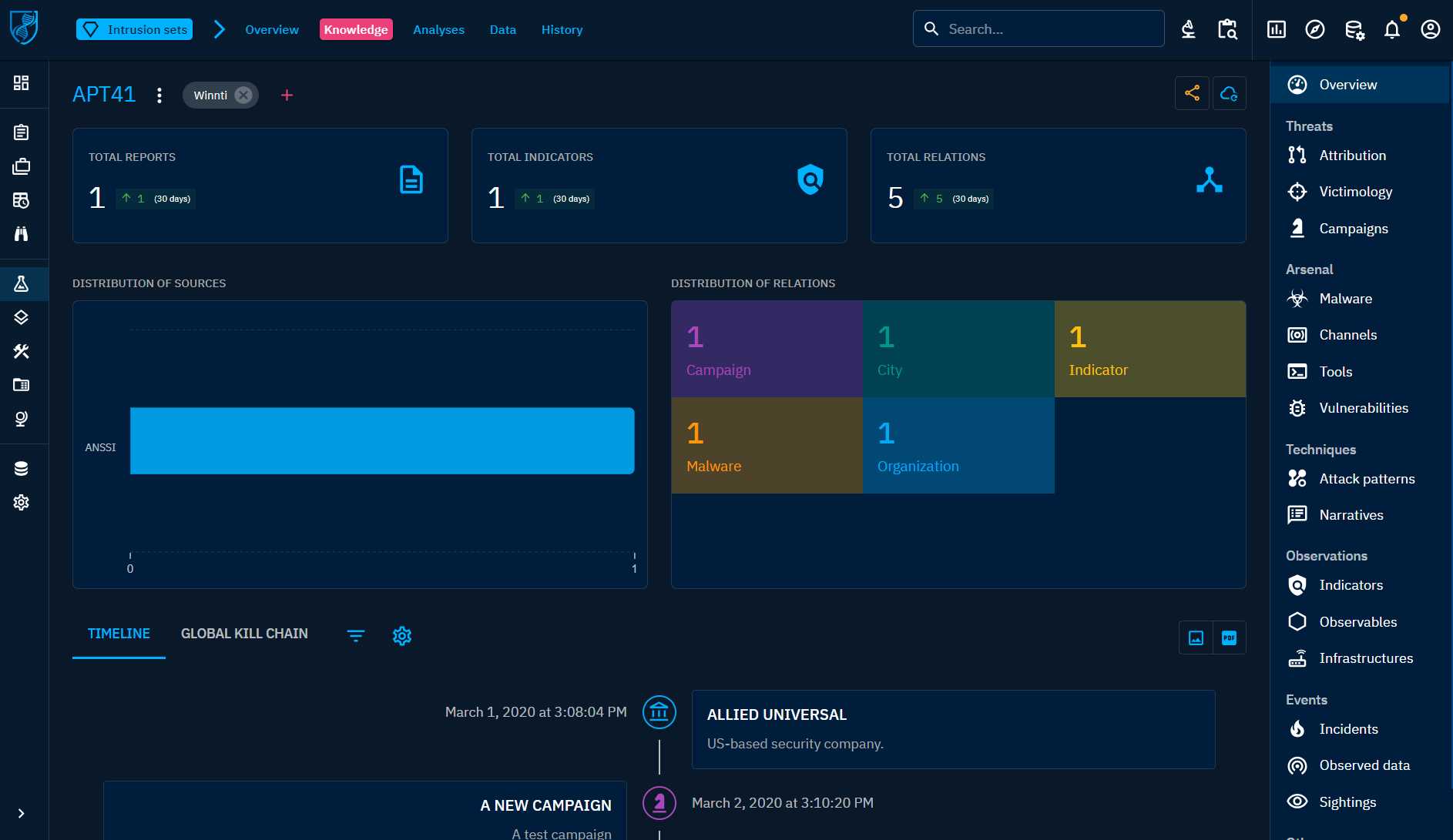 The second part of the platform in the left menu is dedicated to the "cold knowledge", which means this is the entities and relationships used in the hot knowledge. You can see this as the "encyclopedia" of all pieces of knowledge you need to get context: threats, countries, sectors, etc.