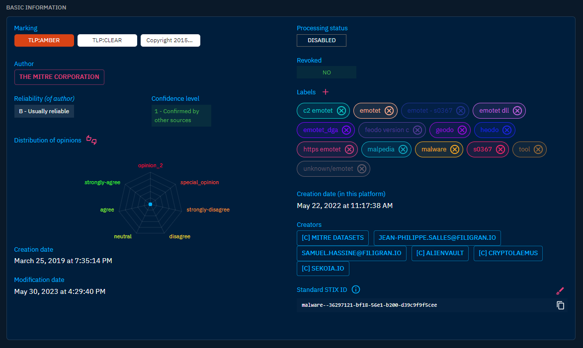 Thus, in the Basic information section, are displayed all common properties to all objects in OpenCTI, such as the marking definition, the author, the labels (i.e. tags), etc.
