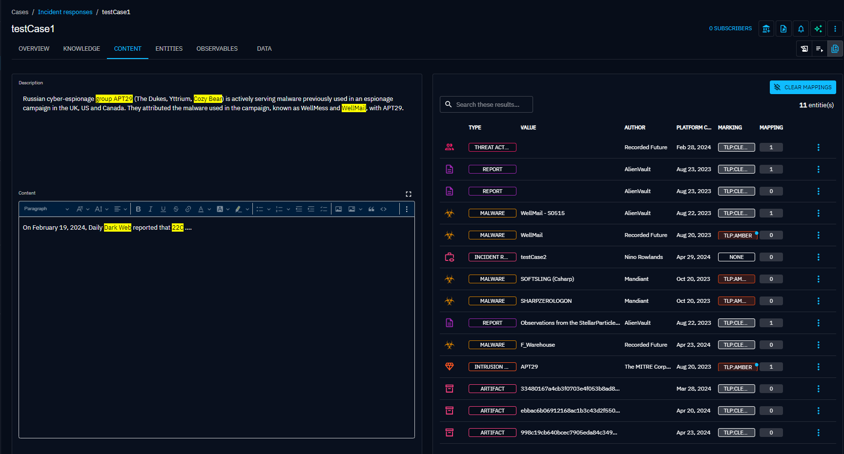 The Content mapping view and the Suggested mapping view are available for a subset of entities: Report, Grouping, Incident, Incident response, Request for Information, and Request for Takedown.