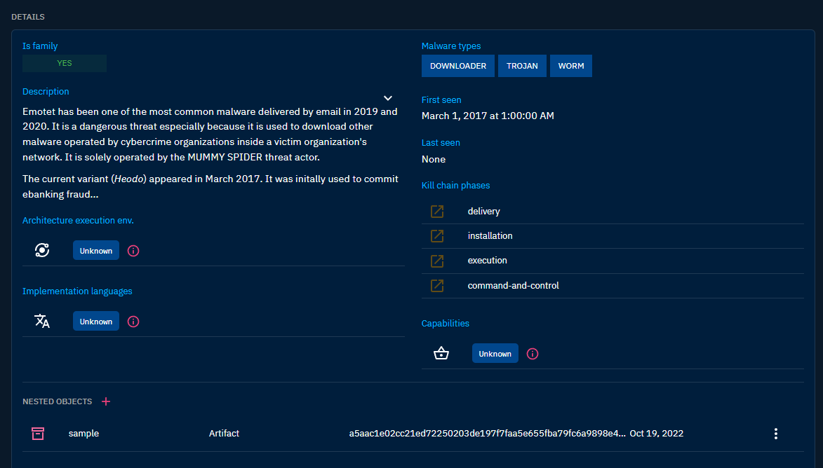 First, you will find the Details section, where are displayed all properties specific to the type of entity you are looking at, an example below with a piece of malware: