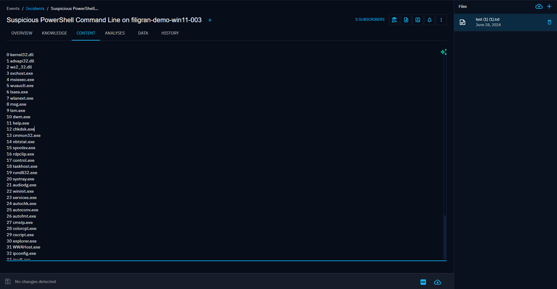 The Content tab is available for all entities. It allows for uploading and creating outcomes documents related to the content of the current entity (in PDF, text, HTML or markdown files). This specific tab enable to previzualize, manage and write deliverable associated with the entity. For example an analytic report to share with other teams, a markdown files to feed a collaborative wiki with, etc.