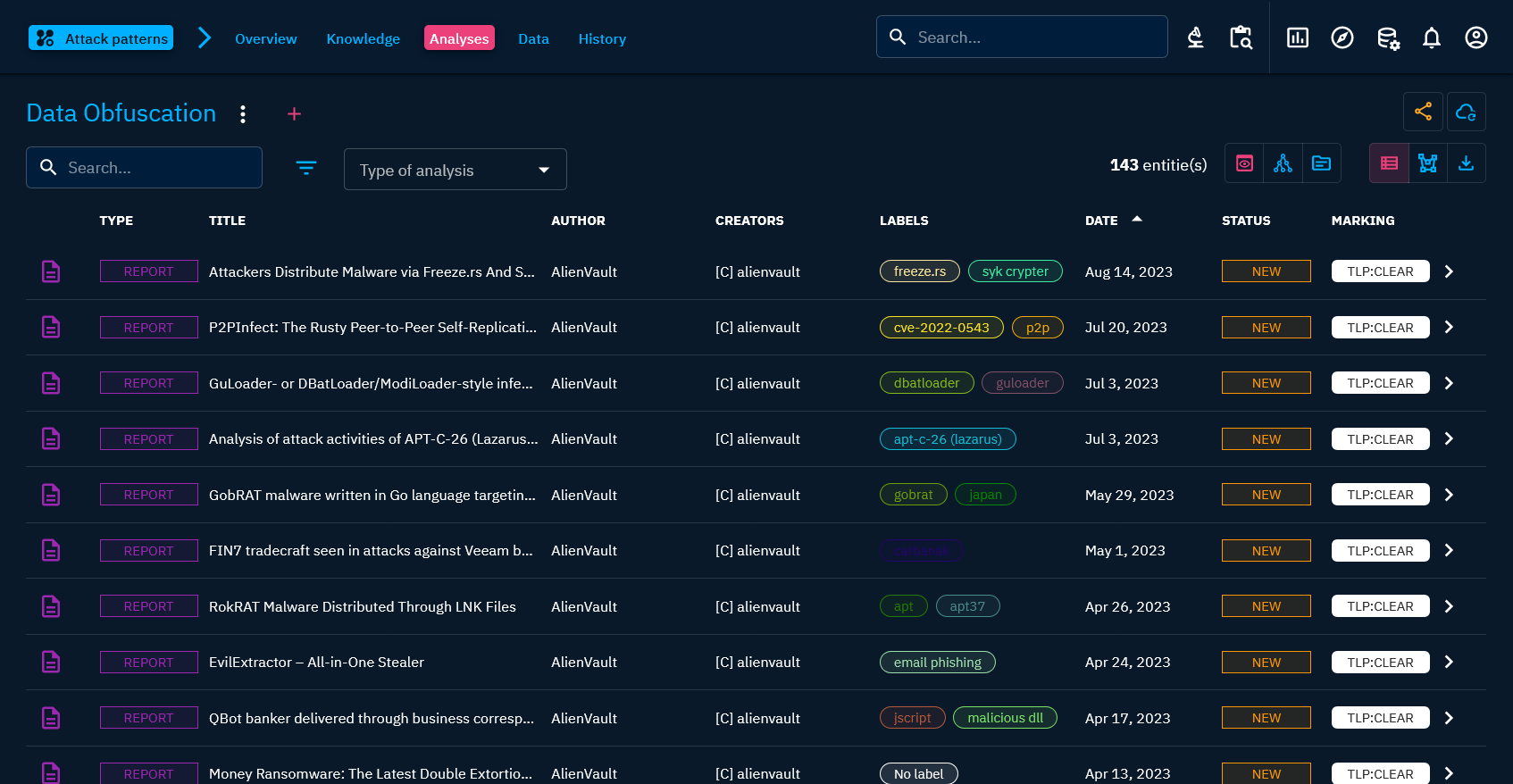 Threats: all threats entities from campaigns to threat actors, including intrusion sets.Arsenal: all tools and pieces of malware used and/or targeted by threats, including vulnerabilities.Techniques: all objects related to tactics and techniques used by threats (TTPs, etc.).Entities: all non-geographical contextual information such as sectors, events, organizations, etc.Locations: all geographical contextual information, from cities to regions, including precise positions.