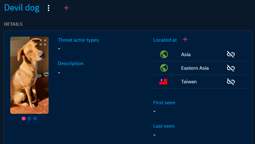 In addition, the Data tab of Threat actors (group), Threat actors (individual), Intrusions sets, Organizations, Individuals have an extra panel: