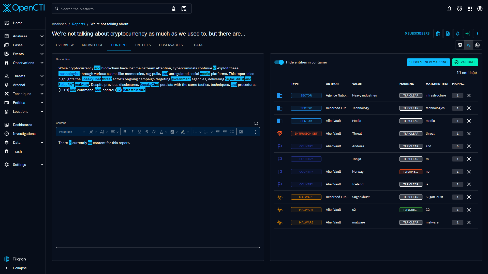 Knowledgetab of those entities (who represents Analyses or Cases that can contains a collection of Objects) is the place to integrate and link together entities. For more information on how to integrate information in OpenCTI using the knowledge tab of a report, please refer to the part Manual creation. - The