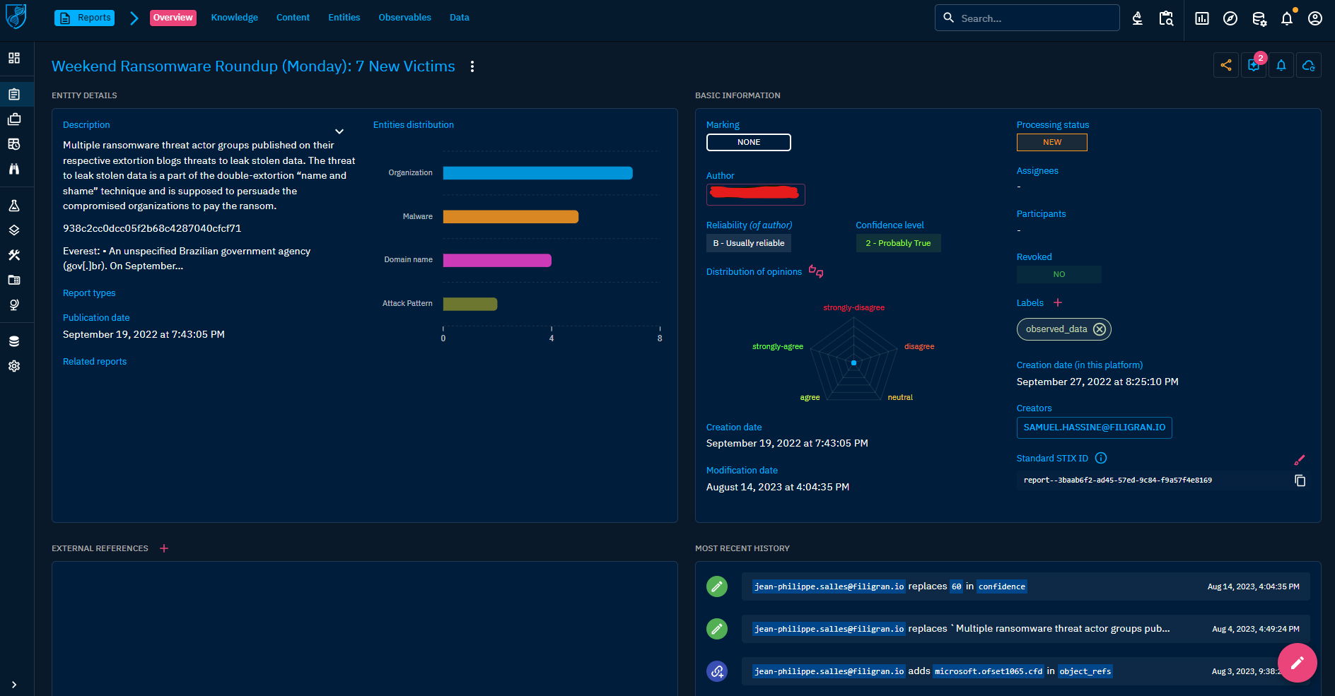 Thus in OpenCTI, we have made the choice to fuse the notion of Credibility with the Confidence level that is commonly used by the majority of users. They have now the liberty to push forward their practice and use both Confidence and Reliability in their daily assessments.