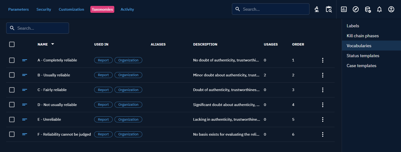 The setting by default is the Reliability scale from NATO Admiralty code. But you can define whatever best fit your organization.