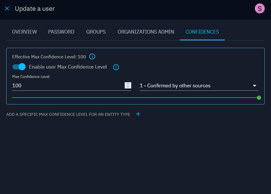 The maximum confidence level can be set at the Group level or at the User level, and can be overridden by entity type for fine-tuning your confidence policy.