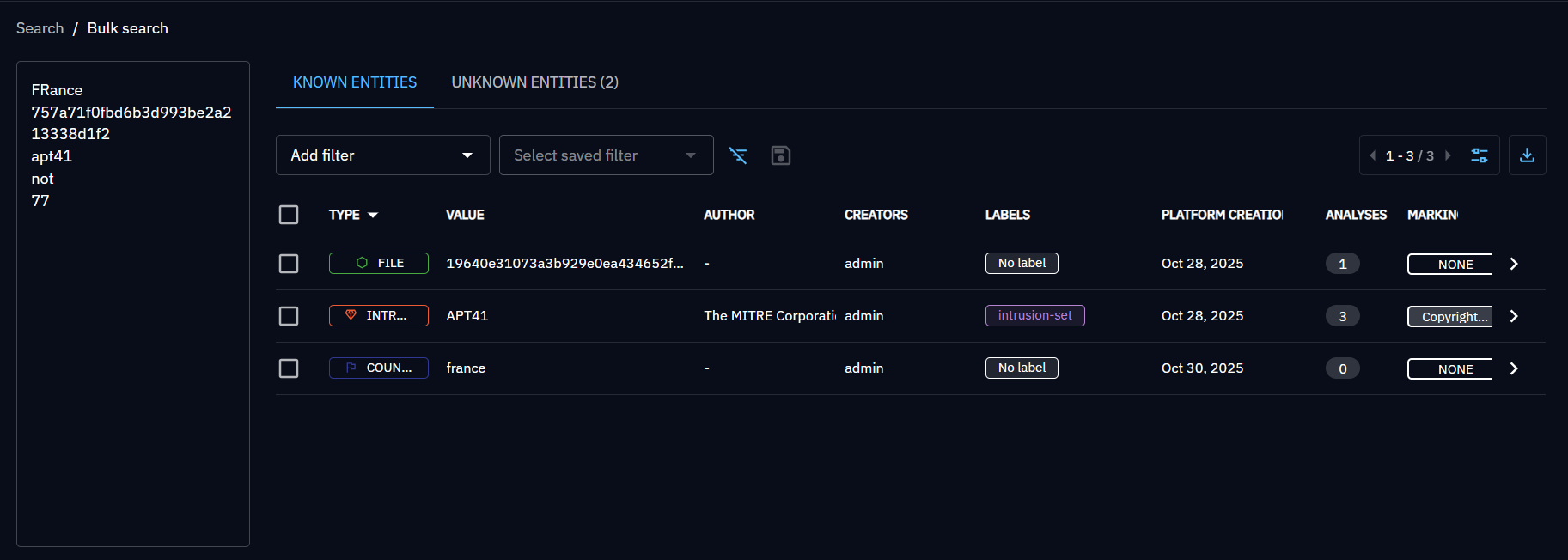 Found entities are listed in the Known entities panel. You can export them or launch massive operations on them, like in other entities lists.