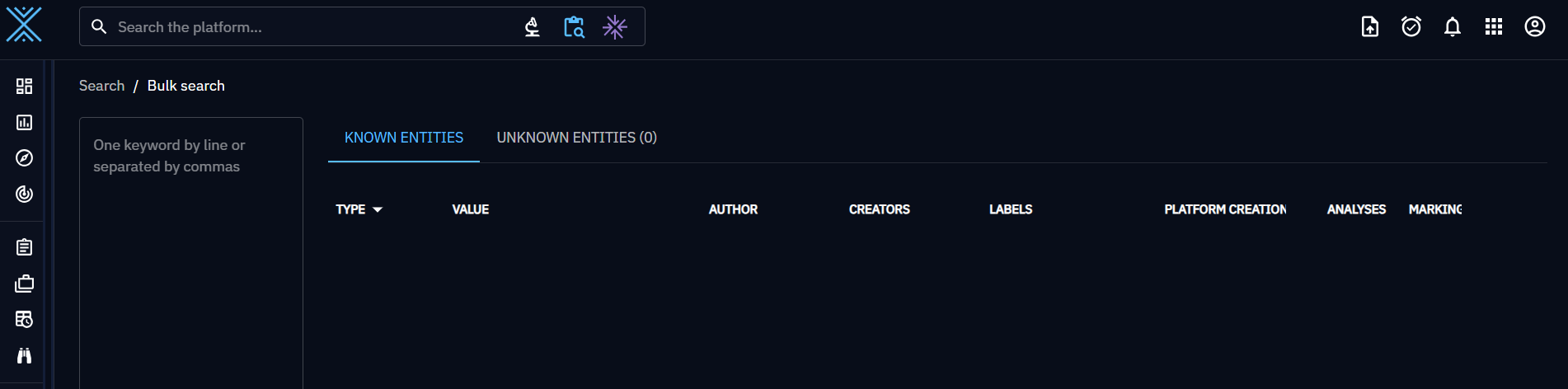 The bulk search capabilities is available in the top bar of the platform and allows you to copy paste a list of keyword or objects (ie. list of domains, list of IP addresses, list of vulnerabilities, etc.) to search in the platform: