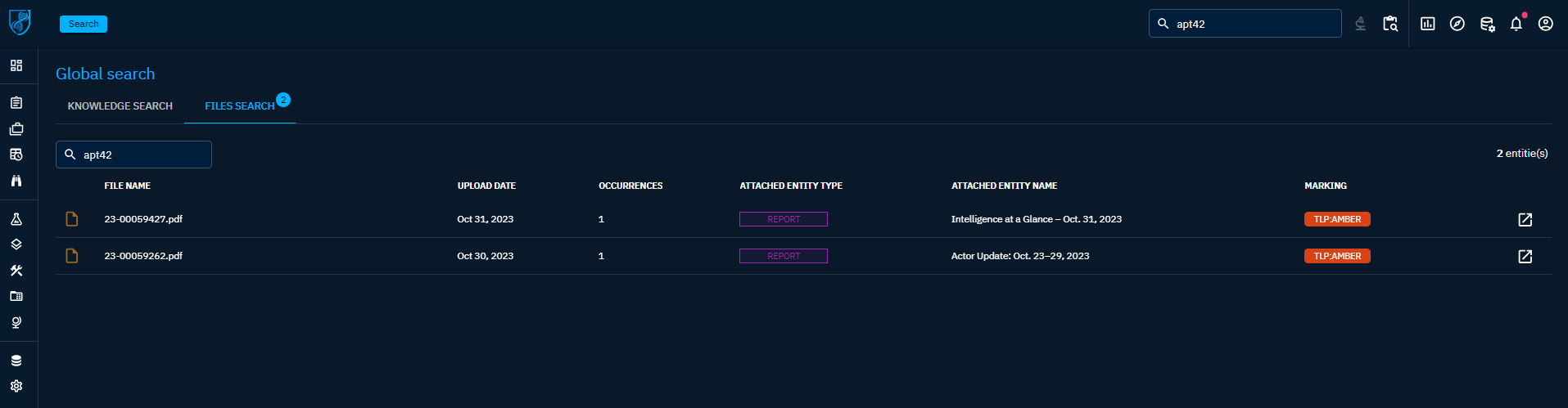 It's possible to extend the global search by keywords to the content of documents uploaded to the platform via the Data import tab, or directly linked to an entity via its Data tab.