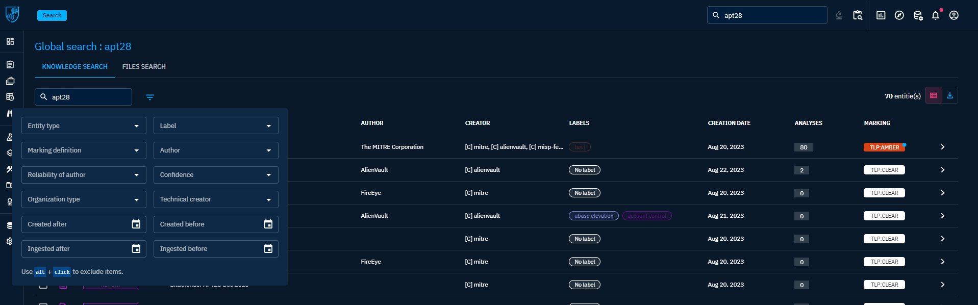 In OpenCTI, you have access to different capabilities to be able to search for knowledge in the platform. In most cases, a search by keyword can be refined with additional filters for instance on the type of object, the author etc.