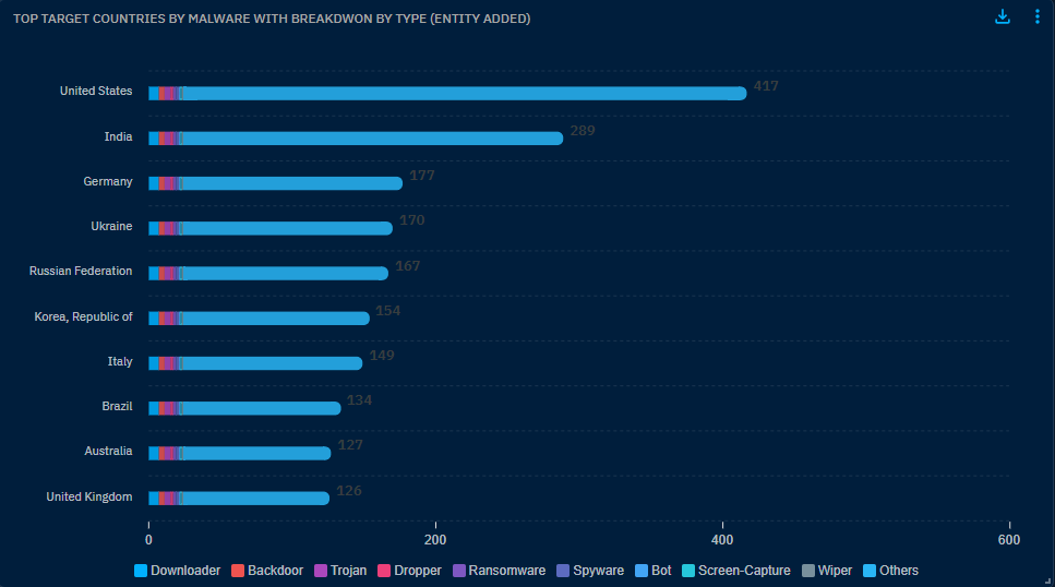 Use case example: I need to understand what are the most targeted countries by malware, and have a breakdown for each country by malware type.