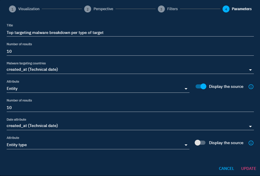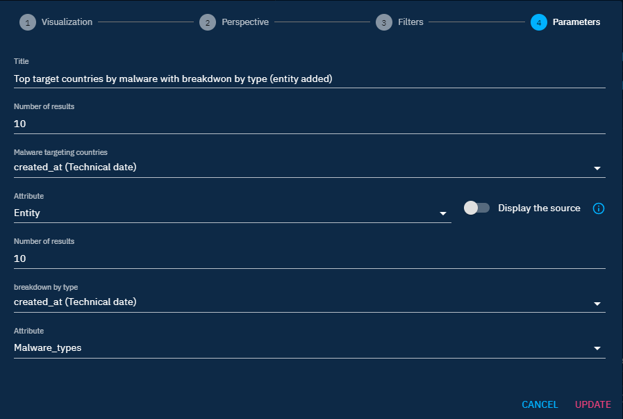 - Use case example: view the list of malware targeting a country breakdown by the type of malware.