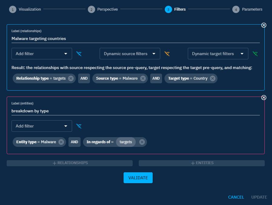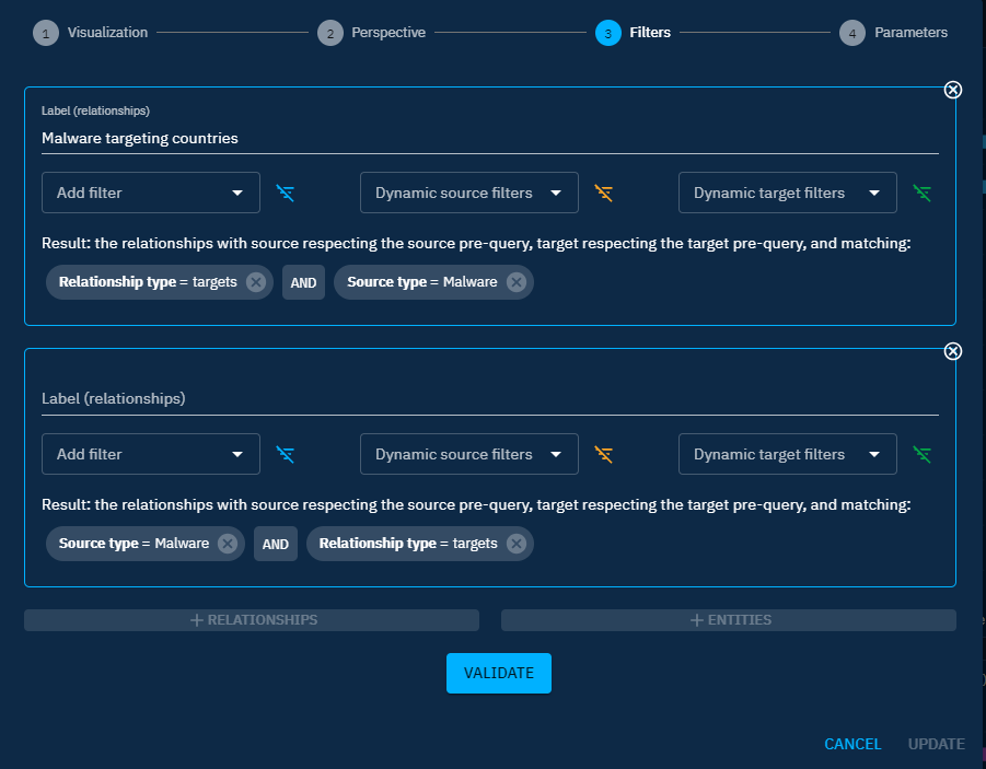 Source type = Malware AND Target type = Countries AND Relation type = Targets. Add a label to your dataset. - Add an entity data set by using access button