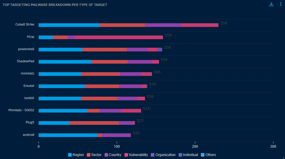 Use case example: I need to understand what are the top targeting malware and have a breakdown of the top targets per malware
