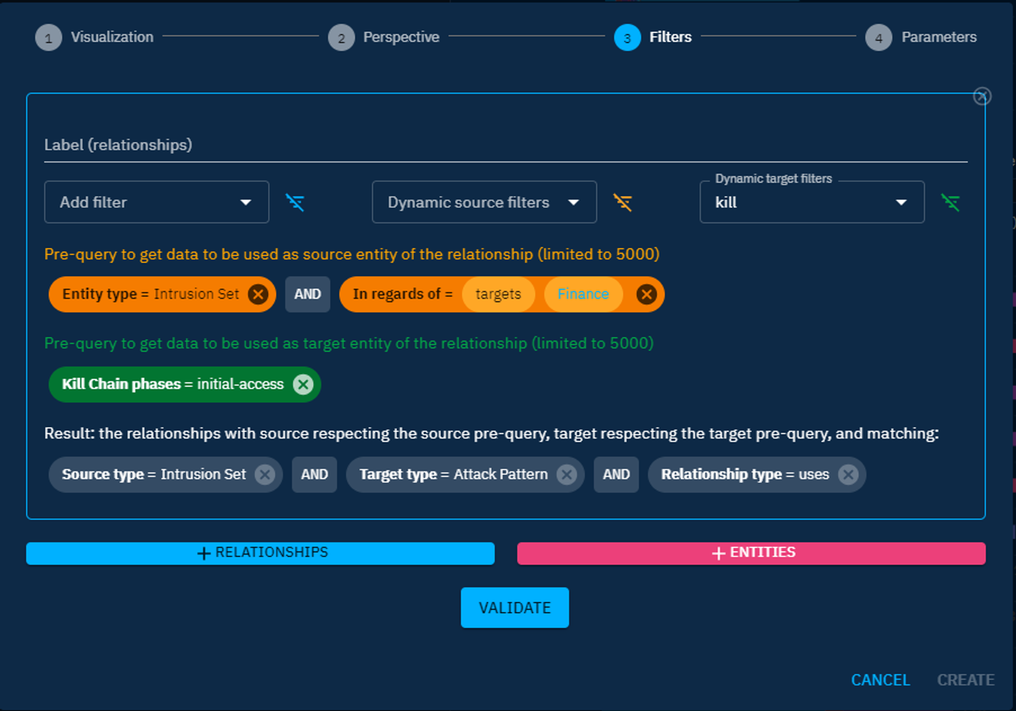 - Classic filters: Define the relationships associated with the use of attack patterns by intrusion sets